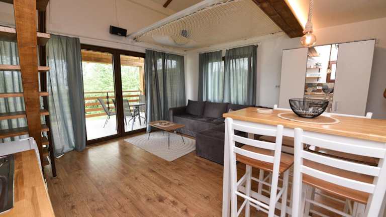 Das Ferienhaus bietet ein Schlafzimmer, ein Wohnzimmer und ein Badezimmer mit Dusche und Haartrockner. Zur Ausstattung gehören eine voll ausgestattete Küchenzeile mit Kühlschrank, Klimaanlage, Heizung sowie Bettwäsche und Handtücher.