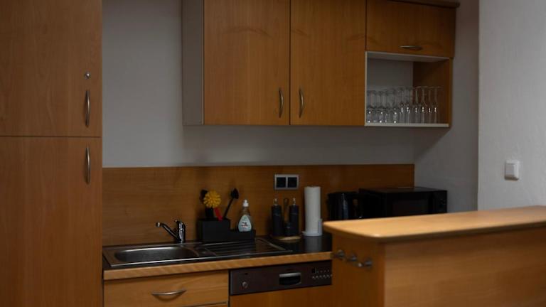 Die Ferienwohnung verfügt über ein Schlafzimmer, ein Badezimmer mit Dusche und Badewanne, ein Wohnzimmer mit Sitz- und Essbereich sowie eine voll ausgestattete Küche mit Kühlschrank, Geschirrspüler und Mikrowelle. Handtücher und Bettwäsche werden bereitgestellt.