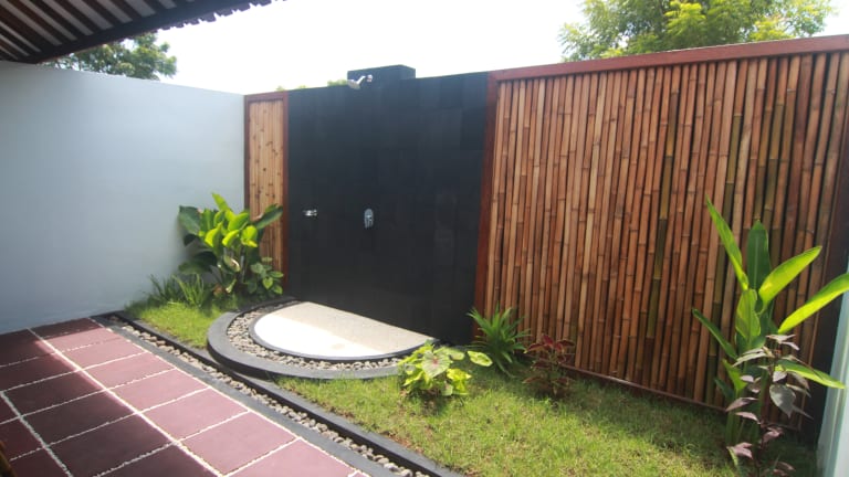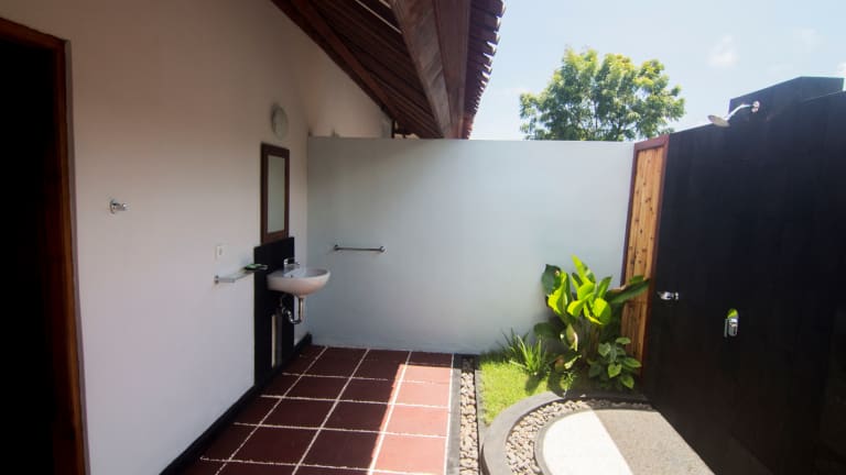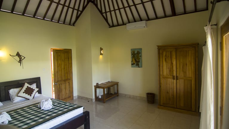 Unsere 4 zimmer sind gross (uber 50m2 inkl. Bad und Terasse) , mit bequeme Betten, aircon, naturlich heissem Wasser in der Dusche, und Aircon. Jeder hat eine kleine Garten vor den Terasse, and der Badezimmer steht teils nicht unterdach - aber nur der Dusche, der unter freiem Himmel ist, in eine kleine Garten. Eine schones gefuehl! Obst und trink-Wasser gibts in den Zimmer taeglich, und eine guten Fruestueck ist der preise imbegriff.