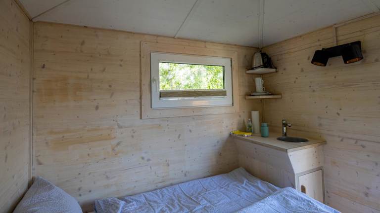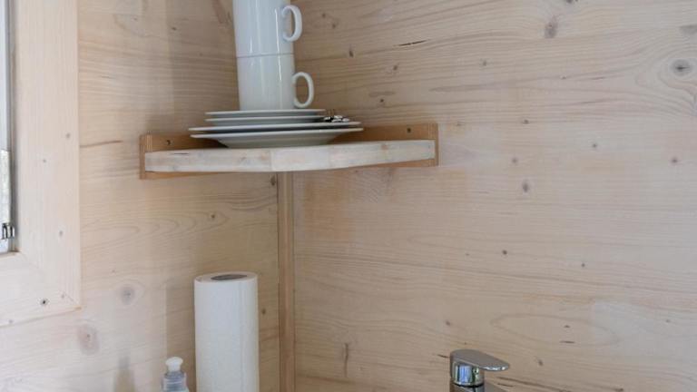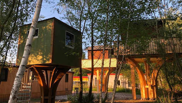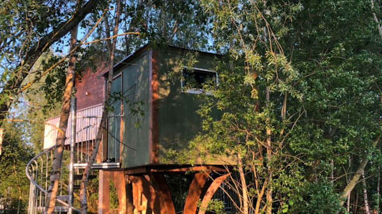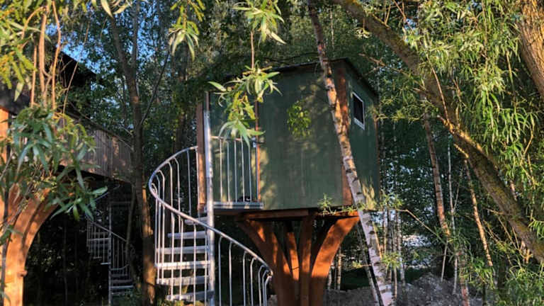 Das Baumhaus - Tiny Haus in der Höhe bietet eine einzigartige Übernachtungsmöglichkeit in einem Baumhaus-Stil und ist umgeben von einem Garten mit einer Terrasse.