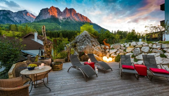 Mitten auf einer Anhöhe gelegen und mit direktem Blick auf die Zugspitze erfahren Ruhesuchende hier herzliche Gastfreundschaft und gehobenen Komfort. Die sprichwörtliche bayerische Gemütlichkeit verbinden wir mit dem Glück der Alpen und einer entspannten Naturverbundenheit. Wählen sie zwischen Hotelzimmer mit Rundumservice oder Ulraub im Apartment für ein wenig mehr Privatsphäre. Neben unserem stilvollen Ambiente in allen Räumlichkeiten bieten wir indoor wie Outdoor Wellness-Highlights und Wohlfühl-Oasen zum Seele baumeln lassen.