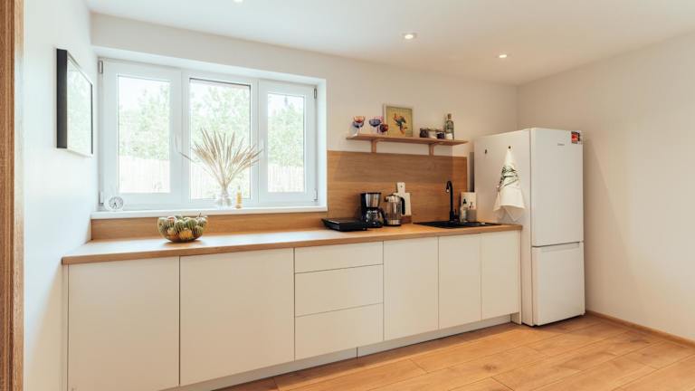 Es sind keine spezifischen Verpflegungsmöglichkeiten dokumentiert. In der voll ausgestatteten Küche können Gäste ihre Mahlzeiten zubereiten.