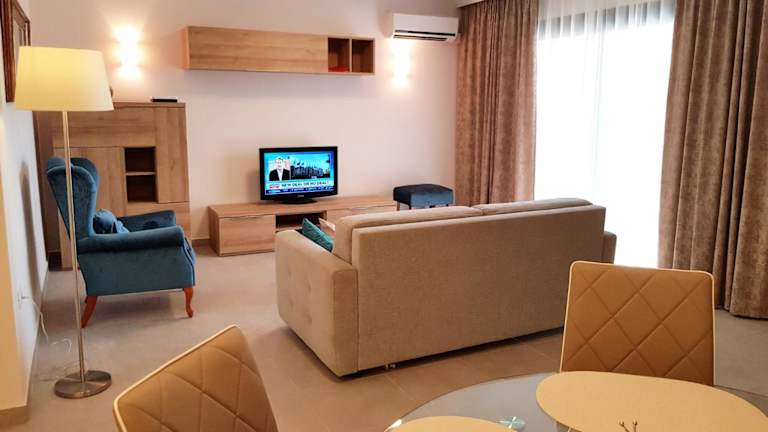 Die Appartements sind mit einer Terrasse, einem Sitzecke, einem Satelliten-Flachbild-TV und einer voll ausgestatteten Küchenzeile ausgestattet, die einen Kühlschrank, eine Mikrowelle, eine Herdplatte, einen Toaster und einen Wasserkocher umfasst. Jedes Appartement verfügt über ein eigenes Badezimmer mit Dusche und Haartrockner.