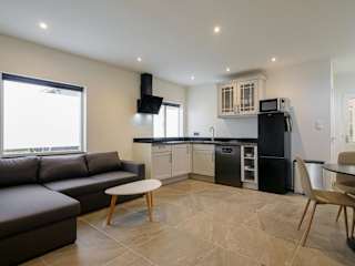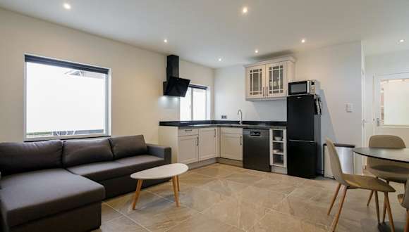 Die Unterkunft umfasst ein Schlafzimmer, eine Küche mit Kühlschrank und Geschirrspüler, einen Flachbild-TV, einen Sitzbereich sowie ein Badezimmer mit Dusche.