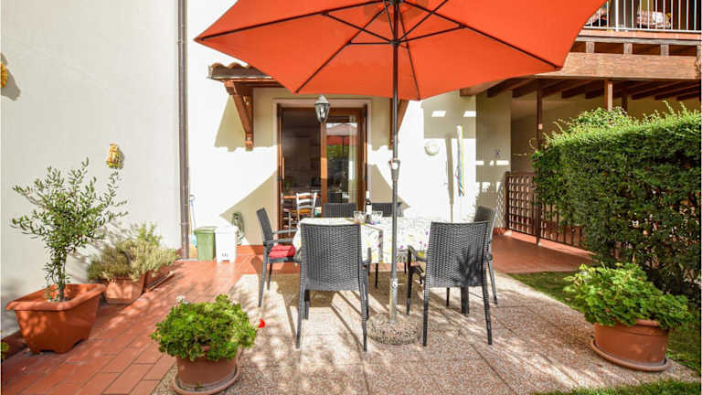 Die Wohnung ist mit zwei Schlafzimmern, einem Wohnzimmer, einer gut ausgestatteten Küche mit Kühlschrank und Geschirrspüler sowie einem TV ausgestattet. Zur weiteren Ausstattung gehören Klimaanlage, Gartenmöbel und Rauchmelder.