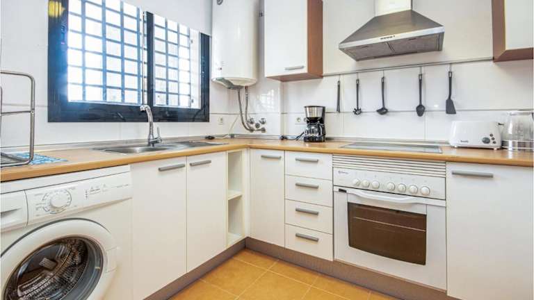 Die Ferienwohnung umfasst zwei Schlafzimmer, ein Wohnzimmer, eine voll ausgestattete Küche mit Kühlschrank und Kaffeemaschine sowie zwei Badezimmer mit Dusche und Badewanne. Die Unterkunft ist eine Nichtraucherunterkunft und verfügt über Klimaanlage sowie Gartenmöbel.