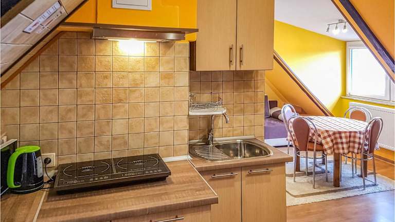 Die Wohnung verfügt über eine voll ausgestattete Küche mit Kühlschrank und Kaffeemaschine, die die Zubereitung von Mahlzeiten während des Aufenthalts ermöglicht.
