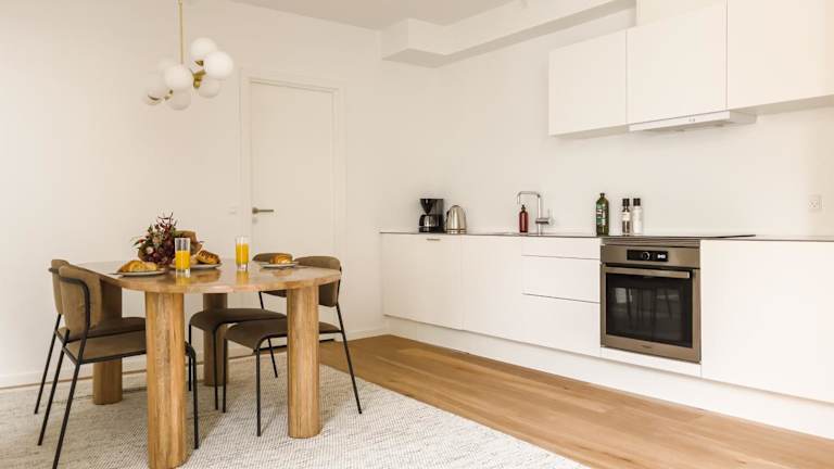 Die Apartments sind mit einer Küche ausgestattet, die einen Kühlschrank, Geschirrspüler, Ofen, Herdplatte, Kaffeemaschine und Wasserkocher umfasst. Zusätzlich sind Lebensmittellieferungen möglich. Es wird jedoch keine spezifische Verpflegung oder Restaurantangebot genannt.