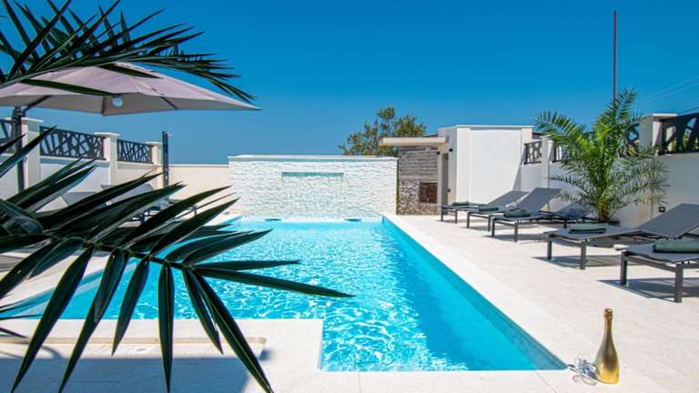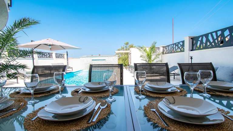Die Villa umfasst 5 Schlafzimmer und eine Küche, die mit einem Kühlschrank und einem Geschirrspüler ausgestattet ist. Weitere Annehmlichkeiten umfassen einen Flachbild-TV, einen Sitzbereich und 4 Badezimmer mit einem Bidet.