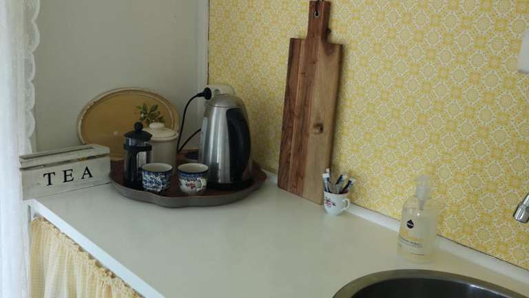 Die Küche der Unterkunft ist mit einem Kühlschrank, einem Ofen, einer Mikrowelle, einer Kaffeemaschine und einem Wasserkocher gut ausgestattet.