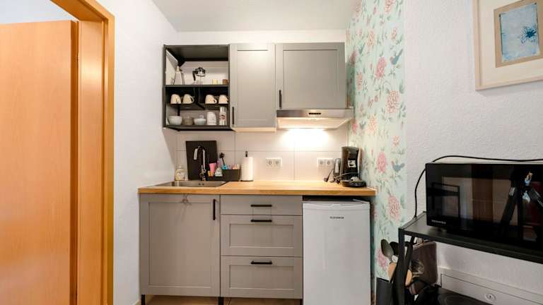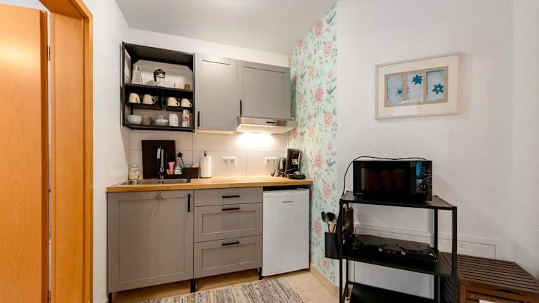 Die Unterkunft verfügt über eine voll ausgestattete Küche mit Kühlschrank und Kaffeemaschine, in der Gäste ihre eigenen Mahlzeiten zubereiten können. Es werden keine weiteren Verpflegungsmöglichkeiten erwähnt.
