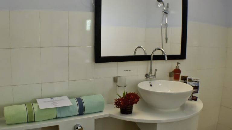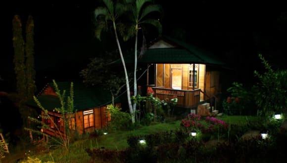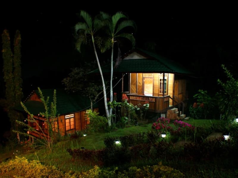Unterbringung im eigenen Bungalow mit Doppelbett oder 2 Einzelbetten und westl. WC/Dusche. Kaltwasser. Fan/ Ventilator. Moskitonetze und Fliegengitter-Fenster. Balkon und privates Rasengrundstück vorhanden. Geräumig, ruhig und traditionell.