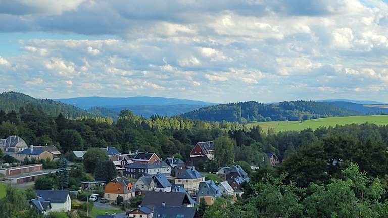 Traumhaft gelegen, in fast 900 m Höhe thront die "Schöne Aussicht" über der waldreichen Mittelgebirgslandschaft auf dem Klingenthaler Aschberg. Von der Veranda und unserer großen Panoramaterrasse schauen sie bei klarem Wetter weit in die Ferne bis ins fränkische Fichtelgebirge.