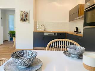 Die Ferienwohnung umfasst zwei Schlafzimmer, ein Wohnzimmer und eine voll ausgestattete Küche mit einem Kühlschrank und einer Kaffeemaschine. Zudem gibt es ein Badezimmer mit Dusche und kostenlosen Pflegeprodukten. Es sind Nichtraucherzimmer verfügbar, und Hunde sind erlaubt.