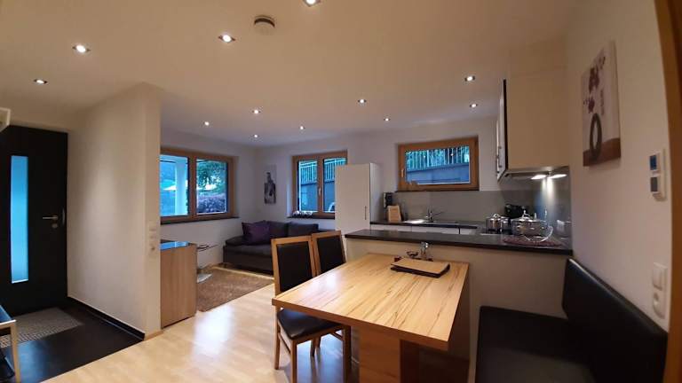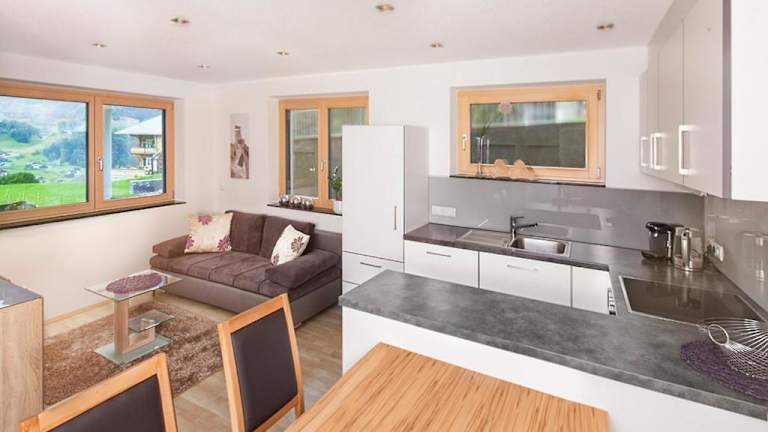 Die Ferienwohnung verfügt über 2 Schlafzimmer, ein Wohnzimmer und eine gut ausgestattete Küche mit Kühlschrank und Geschirrspüler. Zudem gibt es ein Badezimmer mit Dusche. Handtücher und Bettwäsche werden bereitgestellt. Eine Terrasse mit Bergblick ergänzt die Ausstattung.