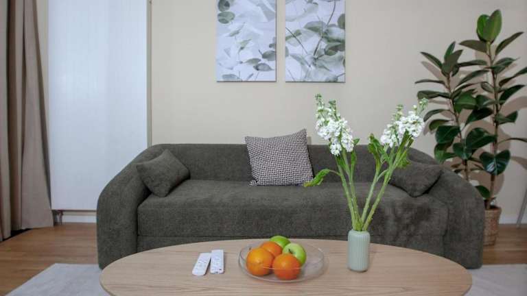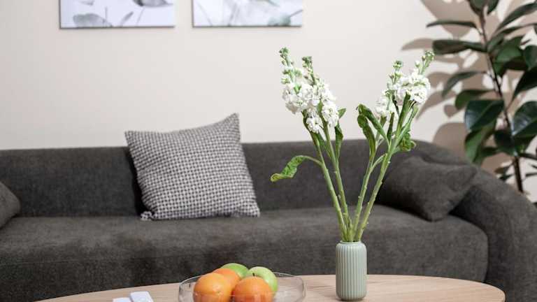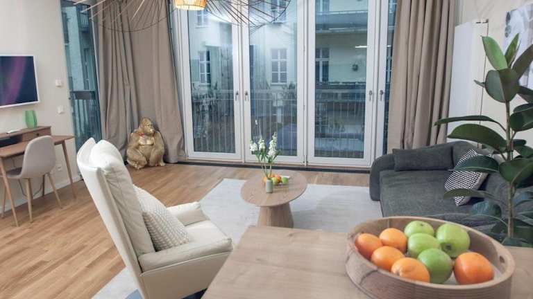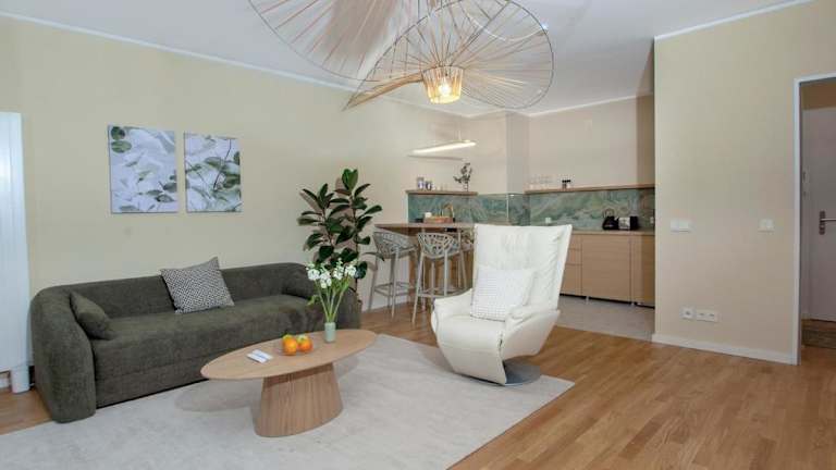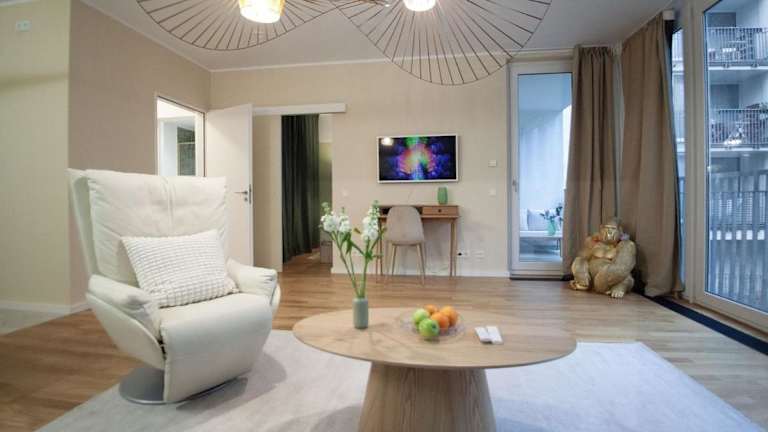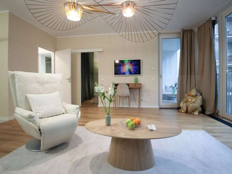Die Ferienwohnung umfasst einen Balkon, ein Schlafzimmer, ein Wohnzimmer sowie eine gut ausgestattete Küche. Zur Ausstattung gehört zudem ein Flachbild-TV.