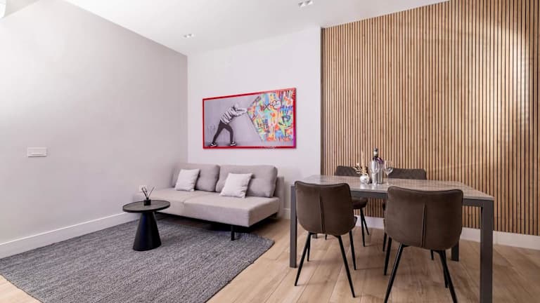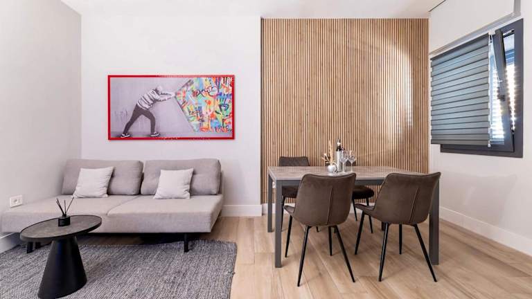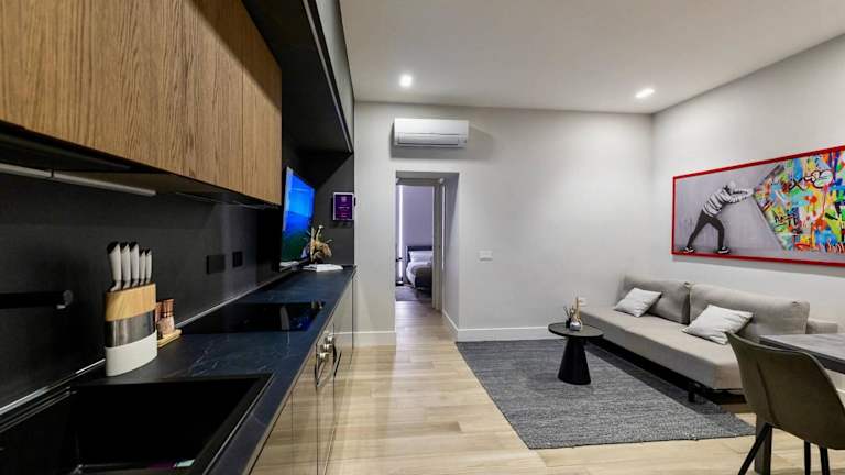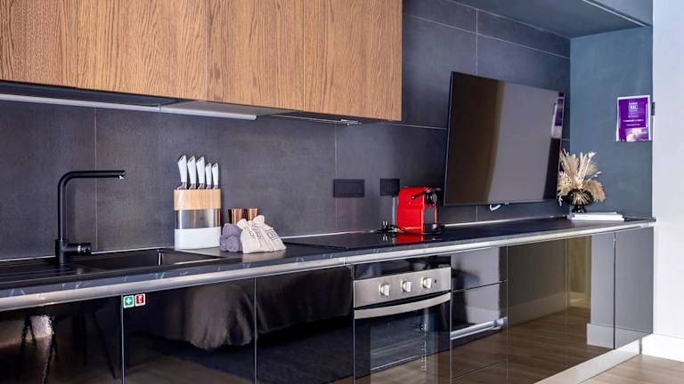Die Suite besteht aus einem Schlafzimmer, einem Wohnzimmer sowie einer voll ausgestatteten Küche, die über einen Kühlschrank und eine Kaffeemaschine verfügt. Es gibt zudem ein Badezimmer mit Bidet und Dusche. Zu den Annehmlichkeiten gehören Klimaanlage, Schallisolierung und Allergikerfreundlichkeit. Handtücher und Bettwäsche werden zur Verfügung gestellt.
