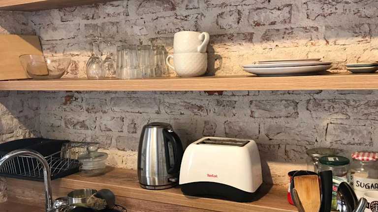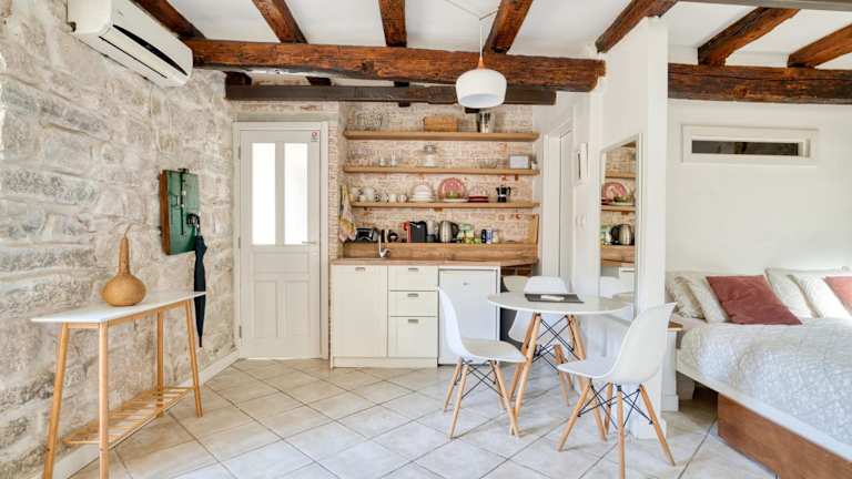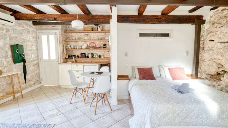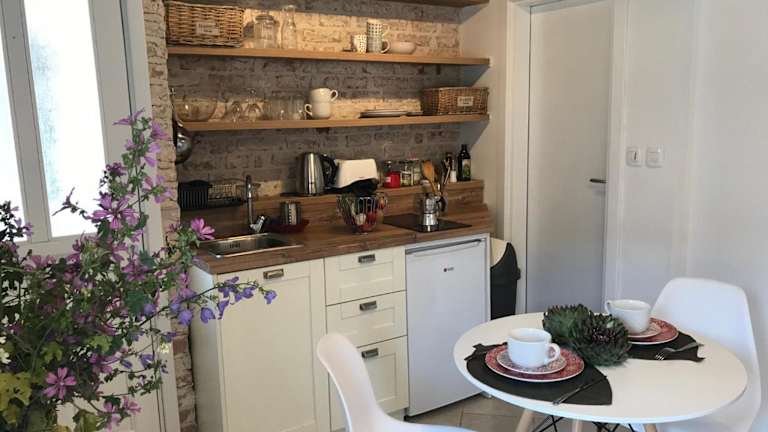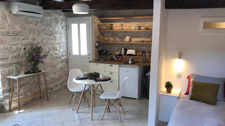 Die Ferienwohnung verfügt über ein Schlafzimmer und ein Wohnzimmer, das mit einer Klimaanlage ausgestattet ist. Eine voll ausgestattete Küche mit Kühlschrank und Wasserkocher ist ebenfalls vorhanden. Das Badezimmer bietet eine Dusche und kostenlose Pflegeprodukte.