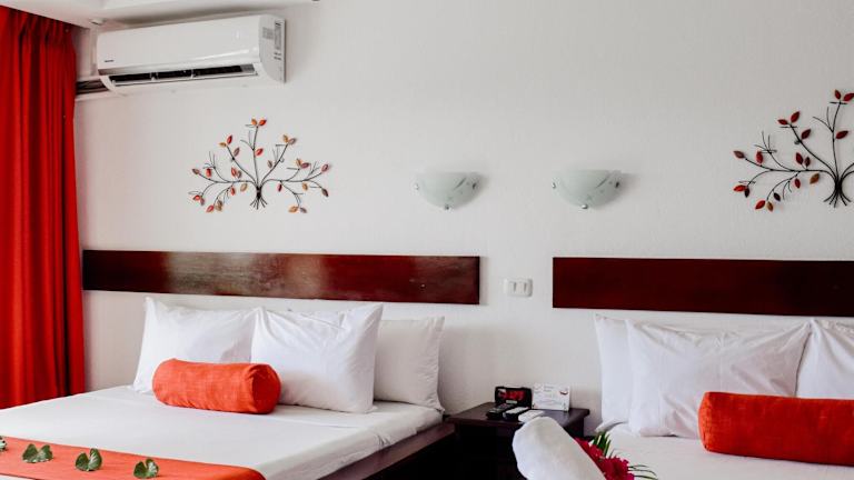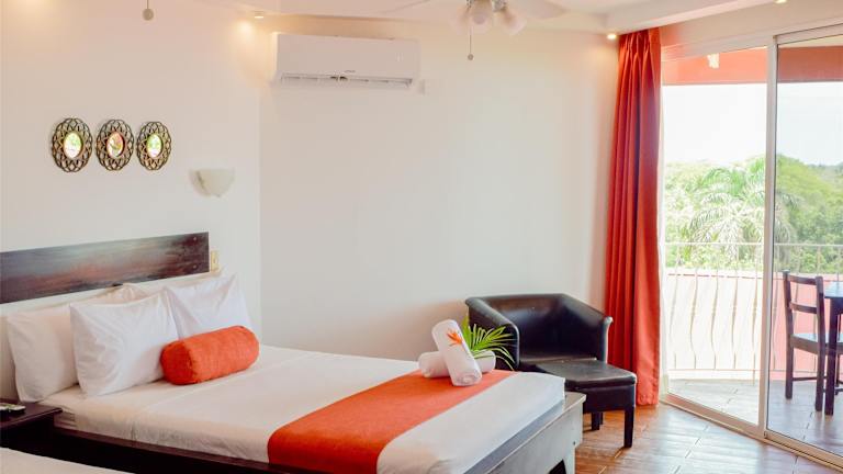 Die Zimmer sind ausgestattet mit Klimaanlage, Ventilator, Safe, Minibar, Schreibtisch und einer Kochnische mit Kühlschrank, Mikrowelle sowie Tee-/Kaffeemaschine. Es gibt Balkone oder Terrassen mit Meerblick, sowie einen Fernseher mit Kabel-/Satellitenempfang und kostenloses WLAN. Die Badezimmer verfügen über eine Dusche und eine Badewanne und sind mit Haartrocknern und Kosmetikartikeln ausgestattet. Familienzimmer sind ebenfalls verfügbar.
