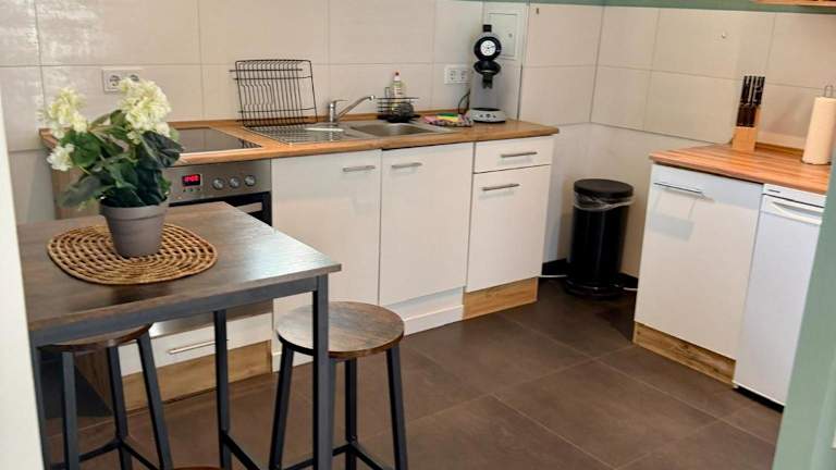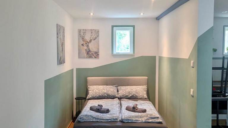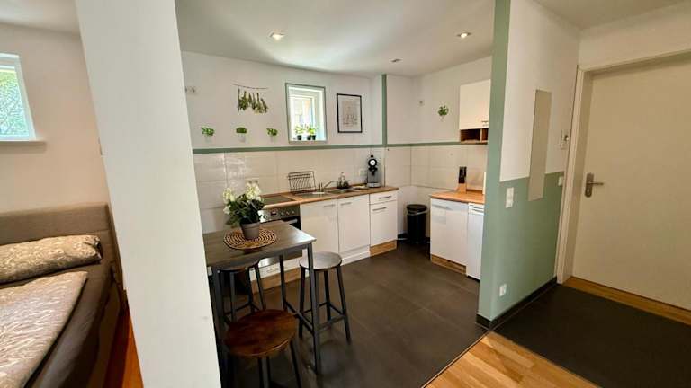 Die Ferienwohnung verfügt über ein Schlafzimmer, eine Küche mit Kühlschrank und Ofen sowie ein Badezimmer mit Dusche und Haartrockner. Handtücher und Bettwäsche sind vorhanden. Zusätzlich stehen Familienzimmer zur Verfügung.