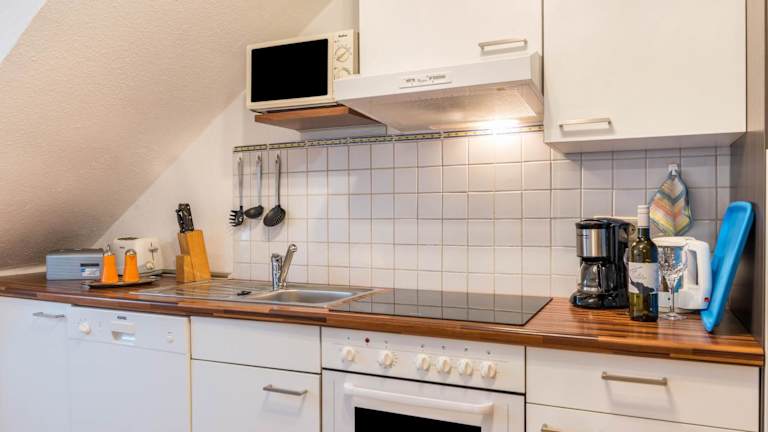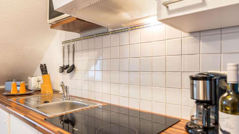 Die Ferienwohnung verfügt über eine voll ausgestattete Küche mit Kühlschrank und Kaffeemaschine, die eigene Verpflegung ermöglicht. Es gibt keine Informationen zu weiteren Verpflegungsangeboten vor Ort.