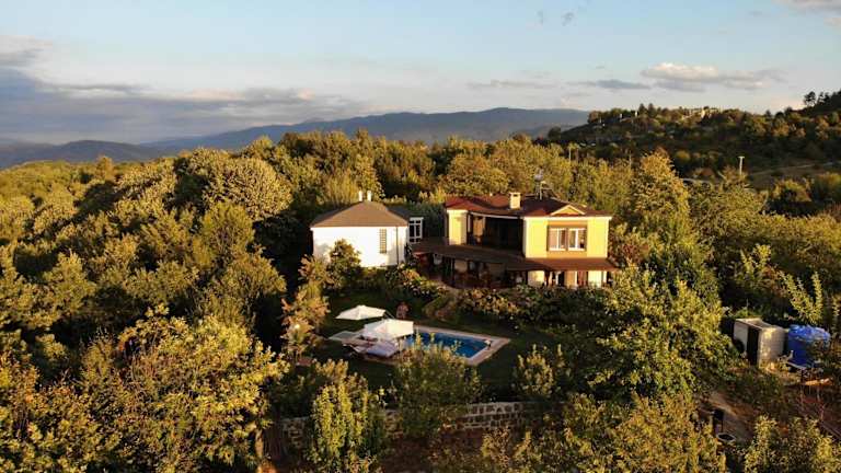 Bizim Ev ist ein Ferienhaus, das vielfältige Annehmlichkeiten bietet, darunter einen saisonalen Außenpool, einen Garten und eine Gemeinschaftslounge. Die Unterkunft ist ideal für Gäste, die Erholung und Komfort in einer natürlichen Umgebung suchen.