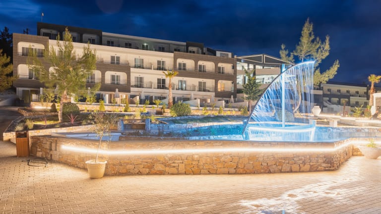 Das Blue Dream Palace Trypiti Beach Spa Resort & Hive Water Park liegt direkt am Strand und bietet einen herrlichen Ausblick auf das Meer. Die umliegenden grünen Hügel und gepflegten Gärten schaffen eine idyllische Atmosphäre. In der Nähe des Hotels gibt es verschiedene Freizeitmöglichkeiten wie ein Spielzimmer und einen Kinderspielplatz. Das Hotel organisiert auch griechische Abende für seine Gäste.