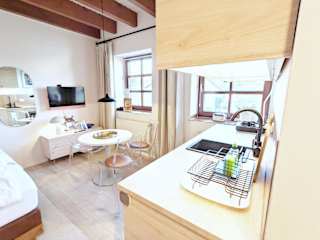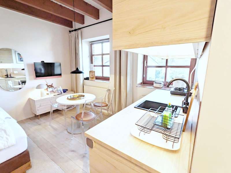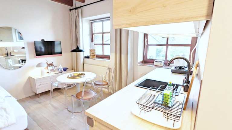 Die Ferienwohnung umfasst ein Schlafzimmer und eine voll ausgestattete Küchenzeile mit Kühlschrank und Ofen. Ein Badezimmer mit Dusche und Haartrockner ist ebenfalls vorhanden. Handtücher und Bettwäsche können gegen Aufpreis bereitgestellt werden. Die Unterkunft ist als Nichtraucherunterkunft klassifiziert.