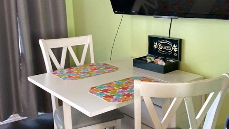 Das klimatisierte Ferienhaus verfügt über ein gemütliches Schlafzimmer, ein geräumiges Wohnzimmer und eine voll ausgestattete Küche mit Kühlschrank und Kaffeemaschine. Das Badezimmer ist mit einer Dusche und kostenlosen Pflegeprodukten ausgestattet. Handtücher und Bettwäsche werden gestellt, um Ihren Aufenthalt so angenehm wie möglich zu gestalten.