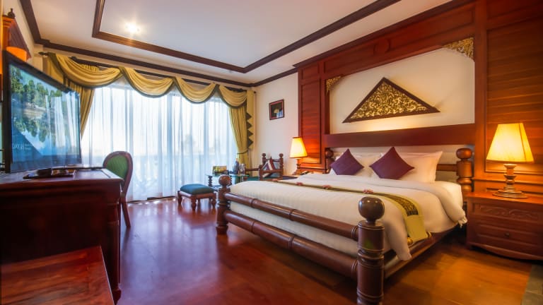 Deluxe Rooms : Number of Deluxe rooms: 52 Size of each room: 40 square meters Spacious rooms excessively built with the famous Cambodian golden wood, delicately replicating the classic Cambodian architecture to offer a warm and homey ambiance. Landmark rooms : Number of Landmark rooms: 127 Size of each room: 47 square meters With a vision to present the Cambodian landmark architecture, these delightful rooms, also inspired by nature, are rich in ornaments of local hand-made silk and crafts-art, precious wooden floors and Green-theme color of Cambodian Art-décor to ensure the profound relaxation and harmonious living. Borei Suites: Number of Suites: 7 Size of each suite: 65 square meters. Borei suites are accomplished in the prestigious way of grandeur living comprising of dedicated living area, make-up corner, and dining table and working desk. It is envisioned to provide both holiday-makers and business travelers a liberated setting where work and leisure can really co-exist. Royal Suites: Number of Suites: 2 Size of each suite: 188 square meters See…hear…smell…taste…touch…and live in the “Royal-Luxury” where you will witness the renaissance of the long-forgotten tradition of harmonious living and experience the Khmer culture’s discovery through your 5 senses. The option featuring large Jacuzzi, private standing rain-shower and separate toilet. This Royal suite is also inclusive of separate living room with its own sofa and TV, bath room, kitchen and bar counter, dinning/meeting table and inter-connected to another bedroom.