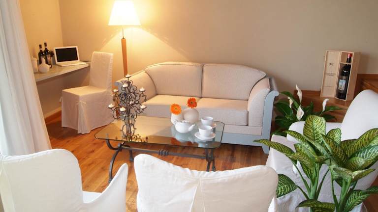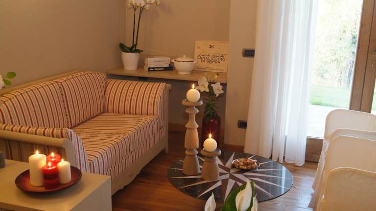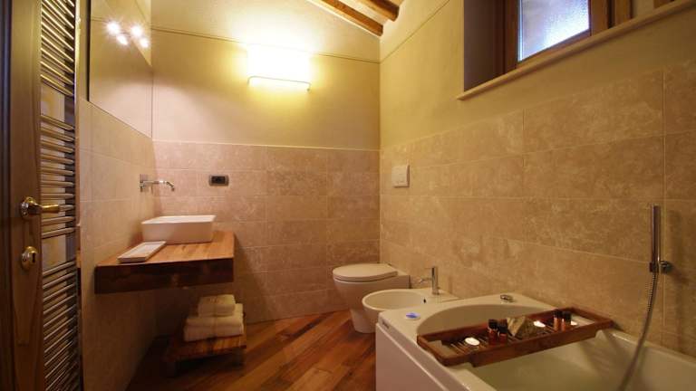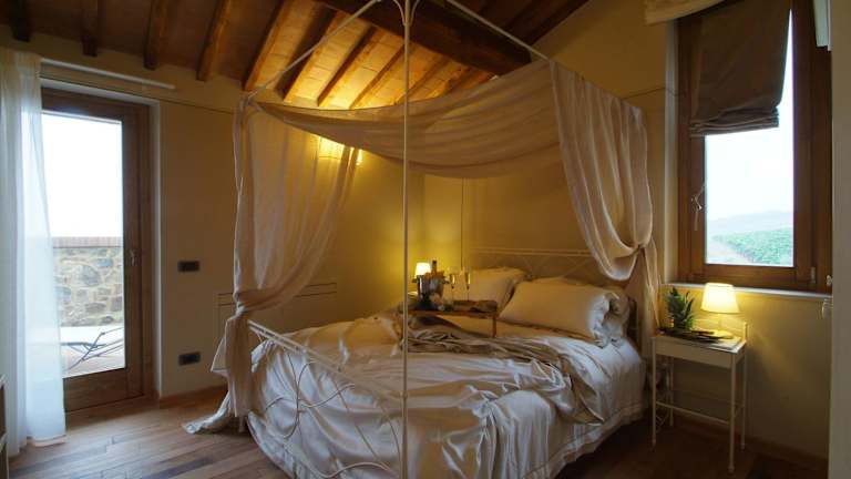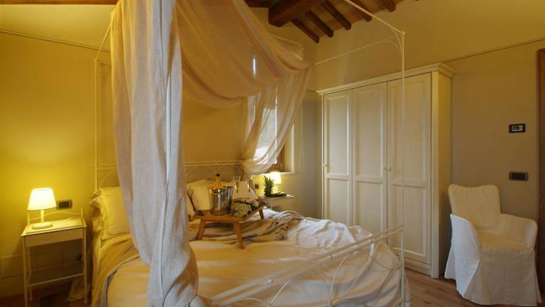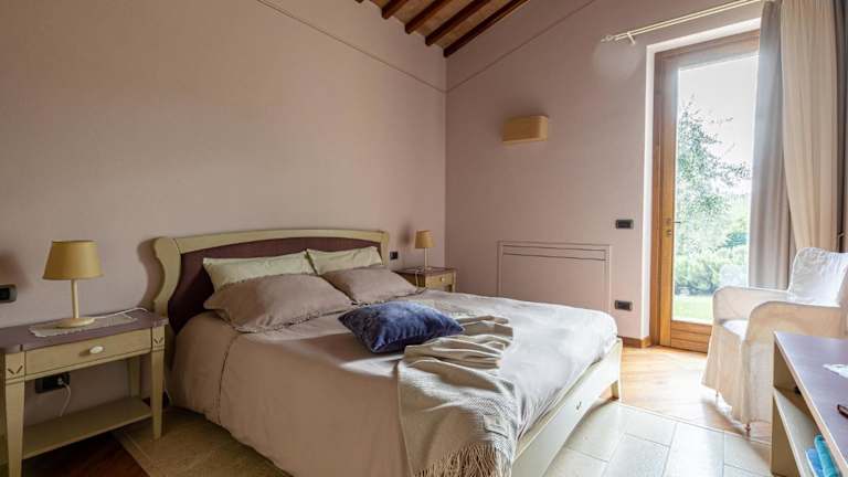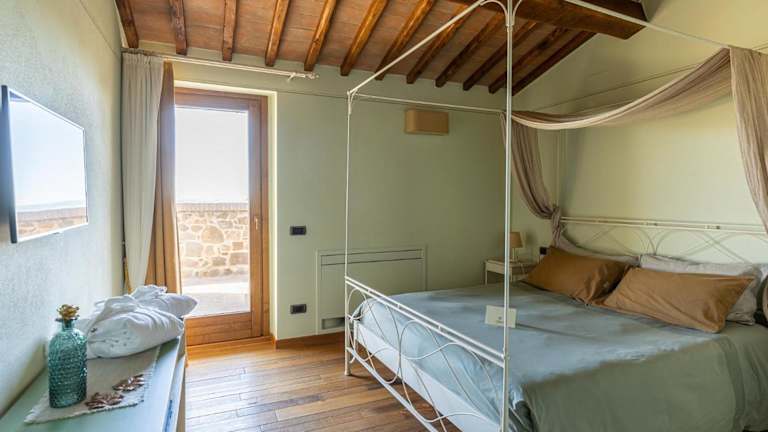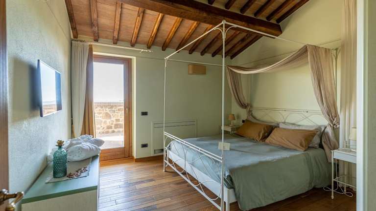 Die Apartments im Borgo Canalicchio Di Sopra Relais sind elegant und komfortabel eingerichtet. Jedes Apartment verfügt über eine voll ausgestattete Küche, in der Gäste ihre eigenen Mahlzeiten zubereiten können, sowie einen gemütlichen Wohnbereich, in dem sie sich entspannen können. Die Zimmer sind klimatisiert und verfügen über schmiedeeiserne Betten und Holzbalkendecken, die dem Raum eine rustikale und charmante Atmosphäre verleihen.