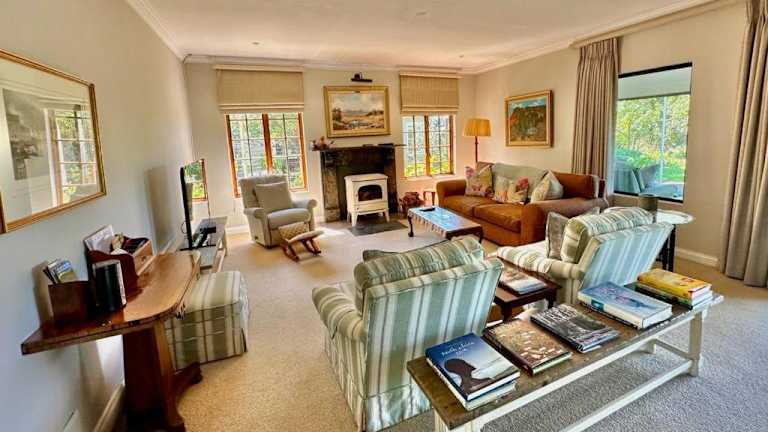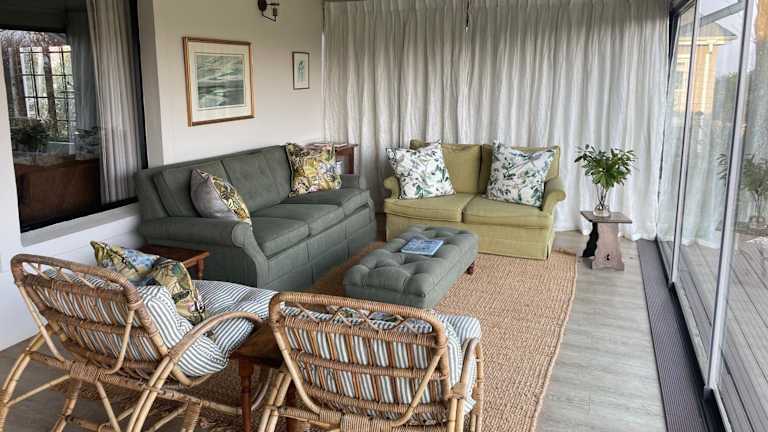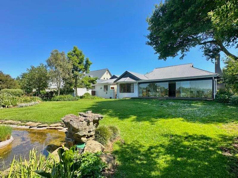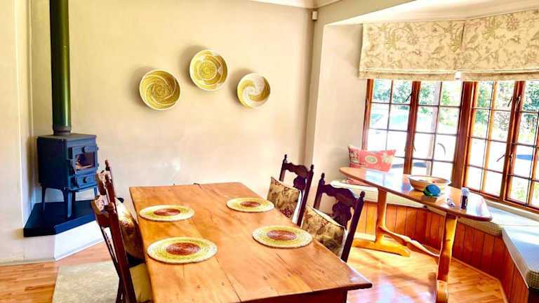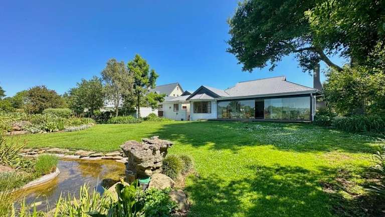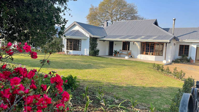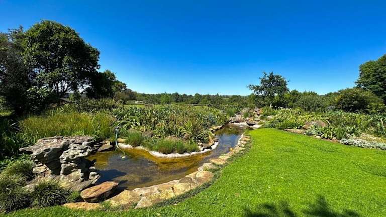 Gowire Village in Nottingham Road, zentralgelegen mit Blick auf die Hügel und einem Garten mit einheimischer Vegetation und einem Koi-Teich.