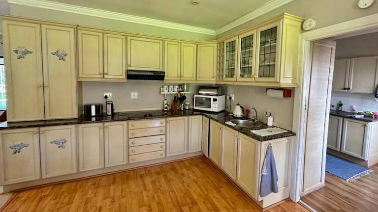 Die gut ausgestattete Küche bietet ein Kochfeld, eine Mikrowelle und einen Geschirrspüler zur Selbstverpflegung.