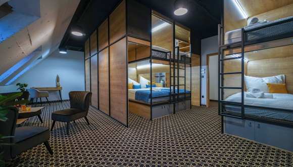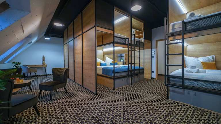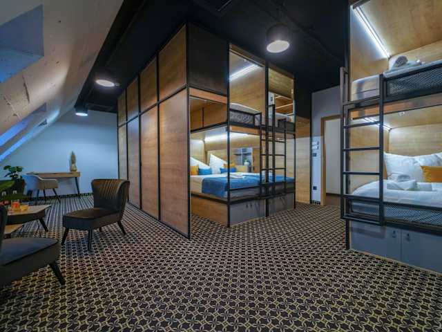 Im CHORS können Sie eine einzigartige Unterkunftserfahrung in exklusiven Kapselzimmern genießen. Jedes Zimmer ist mit einem gemeinschaftlichen Badezimmer und einem luxuriösen Sitzbereich mit Schreibtisch ausgestattet. Für zusätzlichen Komfort stehen auch Business-Zimmer zur Verfügung, die über ein eigenes Bad, ein Sofa und einen Smart-TV von Netflix verfügen. Die Inneneinrichtung und alle Zimmer wurden mit einzigartigen und originellen Gemälden des bekannten slowakischen Malers ergänzt, die speziell für das Hostel angefertigt wurden.