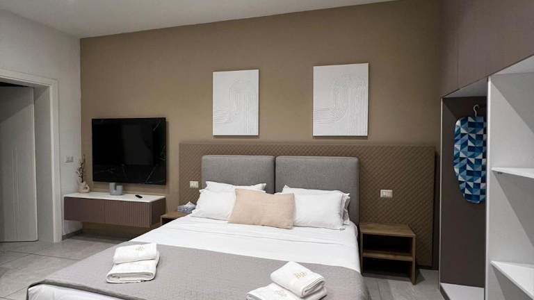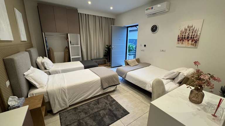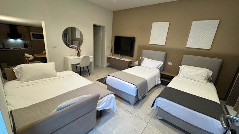 Die Zimmer verfügen über ein eigenes Badezimmer mit Dusche, Klimaanlage, Flachbild-TV und Kühlschrank.
