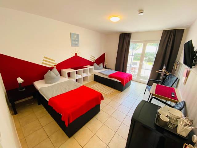 Jedes Zimmer ist mit einem Kleiderschrank, einem Flachbild-TV sowie einem Gemeinschaftsbad ausgestattet. Zur Ausstattung gehören zudem Bettwäsche und Handtücher. Alle Gästezimmer verfügen über einen Kühlschrank.