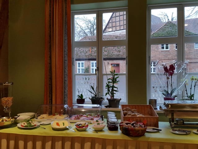 In unserem Hotel verwöhnen wir unsere Gäste mit einem leckerem Frühstücksbüffet. Im Krätergarten der Burganlage kann man in sehr romantischer Umgebung Kaffee, Kuchen und einen kleinen Imbiss genießen. Es gibt direkt in der Burganlage einen wunderschönen Burggasthof, der leider seit über zwei Jahren geschlossen ist und seit dem nach einem neuen Besitzer sucht. In der Stadt, fußläufig etwas 10 min. vom Hotel entfernt, gibt es mehrere Restaurants, in denen Sie für jeden Geschmack und für jeden Geldbeutel das passende Angebot finden.