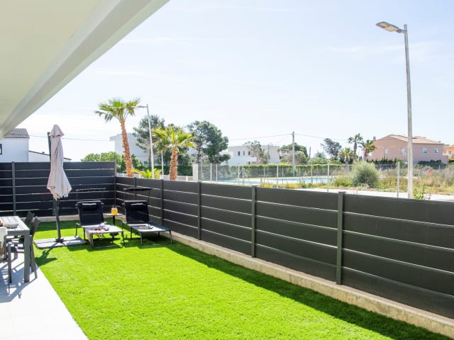 Ferienwohnung aus dem Jahr 2022, geräumig, mit 104 m2 und 65 m2 Terrasse mit Garten, komplett außenliegend, hell und mit direktem Zugang zu den Pools. Besonders attraktiv für Familien oder Paare, die das ganze Jahr über Ruhe und Ausflüge suchen. Highspeed-WLAN, 2 Swimmingpools, Spielplatz, Paddle-Tennis, Parkplatz, ausgestattete Küche, Handseife, Bettwäsche und Handtücher im Reservierungspreis enthalten. Bei der Wohnung handelt es sich um eine vollständig nach Süden ausgerichtete Erdgeschosswohnung, die 2022 erbaut wurde und sich in einem privaten Komplex befindet, zu dem nur Eigentümer und Mieter Zugang haben. Die Schlafzimmer und das Wohnzimmer blicken auf die Terrasse/den Garten, der direkten Zugang zu den Swimmingpools der Anlage bietet. Parkplatz ebenfalls im Preis inbegriffen. Die Anlage verfügt über 2 Swimmingpools, einen Spielplatz, einen Paddle-Tennisplatz und einen Pickleballplatz.