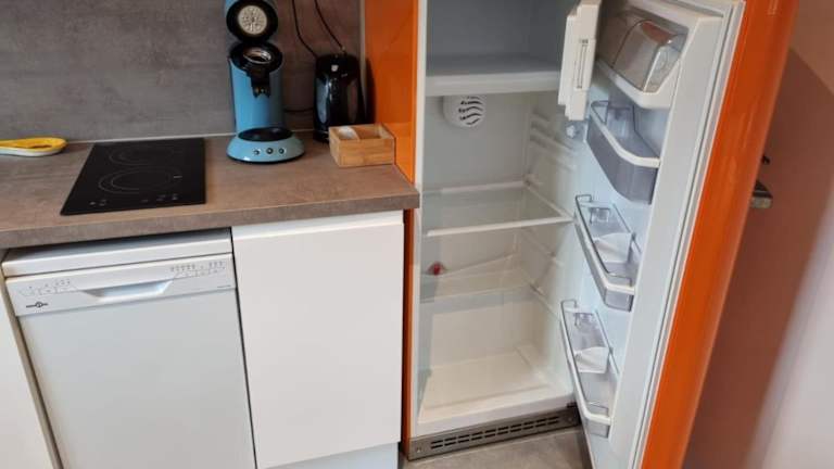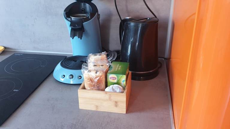 Die Ferienwohnung ist mit einer Küche ausgestattet, die einen Kühlschrank, einen Geschirrspüler, einen Ofen, eine Kaffeemaschine und einen Wasserkocher umfasst.