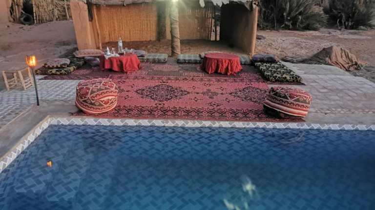 Das Camp Desert Stars in M'hamid El Ghizlane bietet eine einzigartige und authentische Erfahrung in der Wüste Marokkos. Mit kostenfreiem WLAN, einem Garten und einer Gemeinschaftslounge können Sie hier eine entspannte und gemütliche Atmosphäre genießen. Das Halal-Frühstück sowie die Möglichkeit zum Grillen sorgen für kulinarische Genüsse. Darüber hinaus stehen Fahrradverleih und Autovermietung zur Verfügung, um die Umgebung zu erkunden. Der Flughafen Zagora ist nur 107 km entfernt und ein kostenpflichtiger Flughafentransfer wird angeboten.