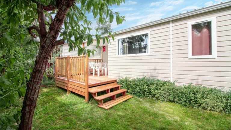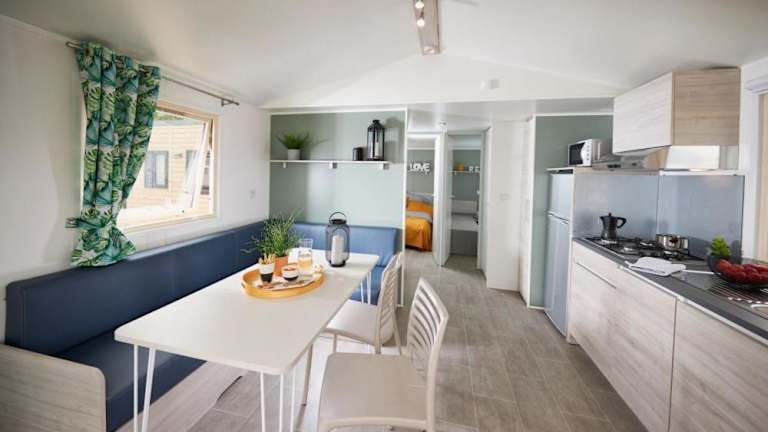 Die Mobilheime auf dem Campingplatz Le Pearl**** sind komfortabel und gemütlich eingerichtet. Jedes Mobilheim verfügt über eine halb überdachte Holzterrasse, eine Küchenzeile mit Mikrowelle und Kaffeemaschine sowie ein eigenes Badezimmer. Einige Mobilheime bieten zusätzliche Annehmlichkeiten wie Klimaanlage, TV und Geschirrspüler.