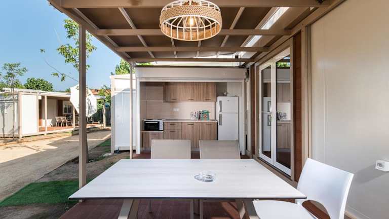 Einige Wohneinheiten sind mit einer Küchenzeile ausgestattet, die über einen Kühlschrank, einen Ofen und eine Herdplatte verfügt.