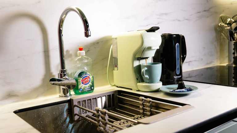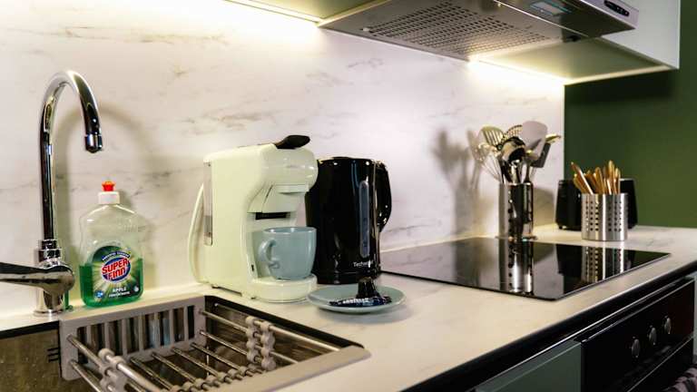 Die Ferienwohnung verfügt über ein Schlafzimmer, ein Wohnzimmer und eine voll ausgestattete Küche mit Kühlschrank und Kaffeemaschine. Für die Hygiene stehen zwei Badezimmer mit Dusche und Whirlpool bereit. Handtücher und Bettwäsche werden bereitgestellt.