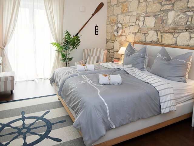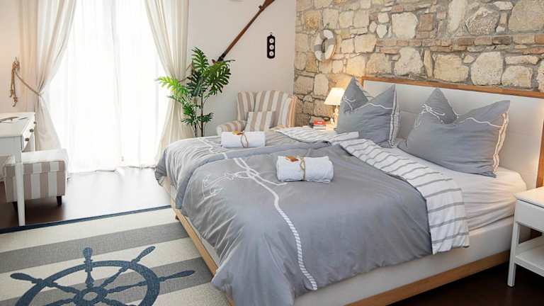 Die Captain's Suite bietet ein modernes und komfortables Apartment mit zwei Schlafzimmern, in dem Sie sich wie zu Hause fühlen können. Das Apartment verfügt über ein voll ausgestattetes Badezimmer, hochwertige Bettwäsche und Handtücher sowie einen Flachbild-TV und einen Essbereich. Die voll ausgestattete Küche ermöglicht es Ihnen, Ihre eigenen Mahlzeiten zuzubereiten, und der Balkon bietet einen schönen Blick auf den Garten.