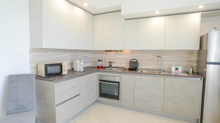 Die Ferienwohnung verfügt über zwei Schlafzimmer, ein Badezimmer mit Bidet, eine Küche mit Kühlschrank und Geschirrspüler, sowie einen Sitzbereich. Zur Ausstattung gehören ein Flachbild-TV, Handtücher und Bettwäsche. Es ist ein Aufzug vorhanden.
