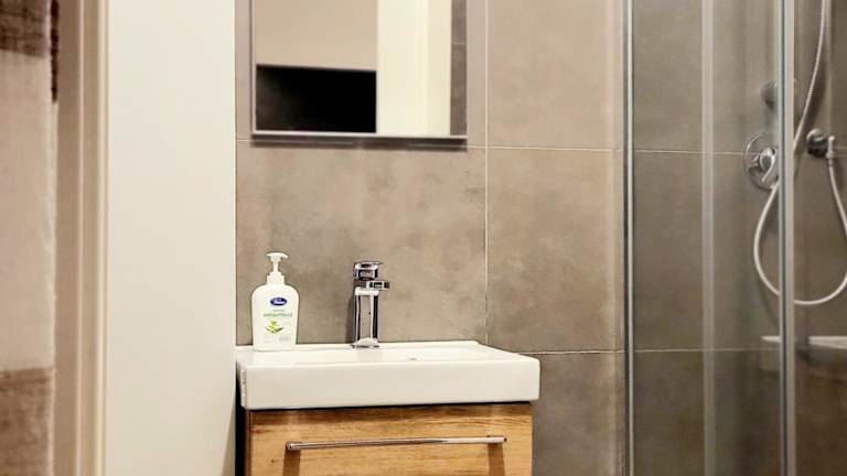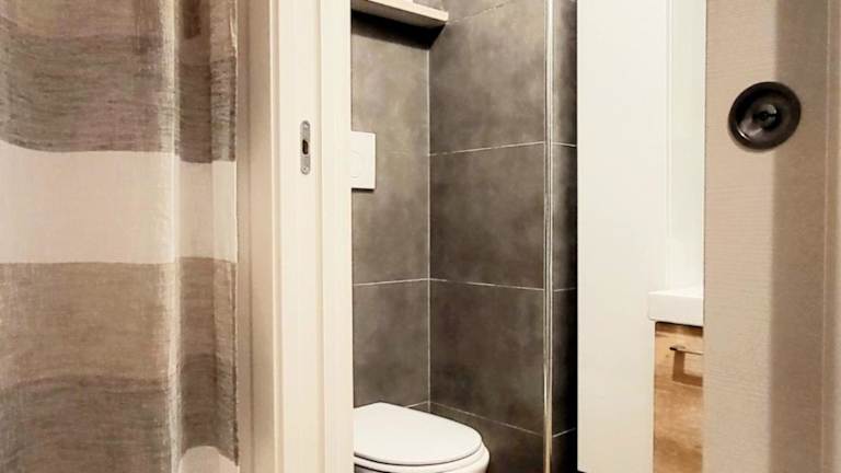 Das Ferienhaus umfasst ein Schlafzimmer und ein Badezimmer mit Dusche.
