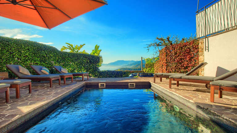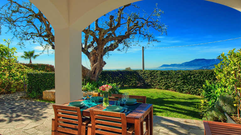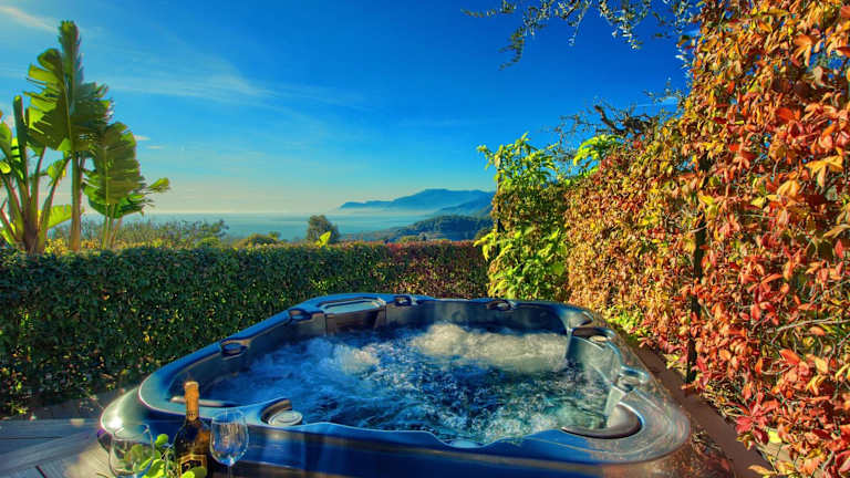 Die Unterkunft Casa con 2 camere da letto, piscina jacuzzi AC wifi e bici elettriche bietet Übernachtungsmöglichkeiten in einem Ferienhaus mit kostenfreiem WLAN, Meerblick und verschiedenen Annehmlichkeiten wie einem Außenpool und einem Garten.