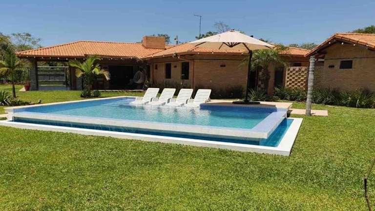 Casa con Piscina, Quincho, Cancha de Futbol/Volley bietet Übernachtungsmöglichkeiten in einem Ferienhaus mit einem Außenpool, eigenem Garten und kostenlosem Privatparkplatz. Es handelt sich um eine Unterkunft mit Klimaanlage, die über alle notwendigen Annehmlichkeiten für einen komfortablen Aufenthalt verfügt.