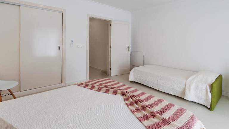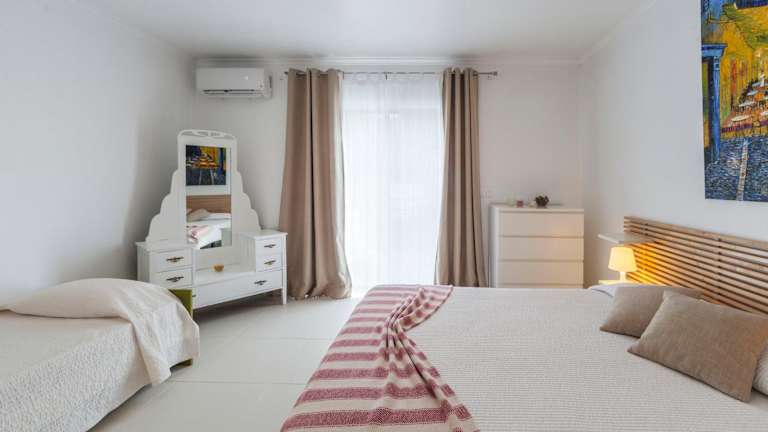 Das Ferienhaus umfasst ein Schlafzimmer, ein Wohnzimmer, zwei Badezimmer mit Bidet und Dusche sowie einen Balkon. Die Küche ist mit einem Kühlschrank und einer Kaffeemaschine ausgestattet. Handtücher und Bettwäsche werden bereitgestellt und das Ferienhaus ist klimatisiert.