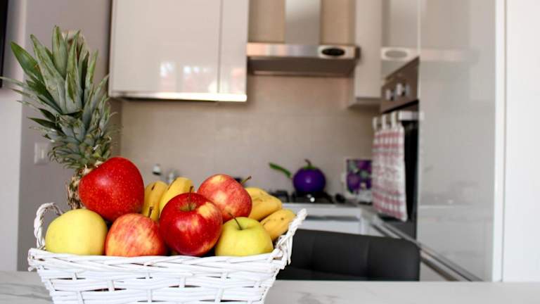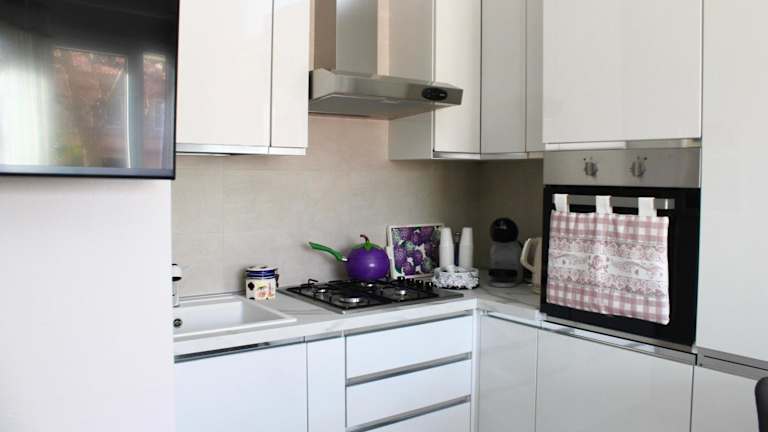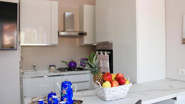 Die Küche der Ferienwohnung ist mit einem Kühlschrank, einem Ofen, einer Mikrowelle sowie einer Kaffeemaschine ausgestattet, was die Selbstversorgung ermöglicht.